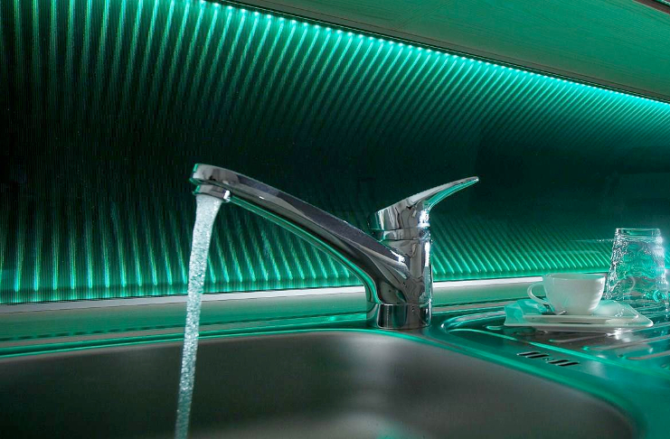 Les multiples applications de ce verre innovant permettent de créer des effets décoratifs de caractère : en crédence ou inséré dans les meubles, au sol ou au plafond, en applique lumineuse ou en signalétique, en cloison ou dans des marches d'escalier.
