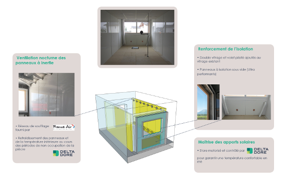 Pour cela, cette rénovation en kit prévoit l'installation de panneaux constitués de matériaux à changement de phase (MCP), des stores et doubles vitrages ainsi que des panneaux isolants sous vide en allège. La solution intègre le pilotage de la ventilation et des stores grâce à un contrôleur développé par Delta Dore, le DB-70. Cette rénovation peut donc s'appliquer à la rénovation partielle de bureaux souffrant particulièrement d'inconfort thermique sans avoir à rénover la totalité du bâtiment en une seule fois.