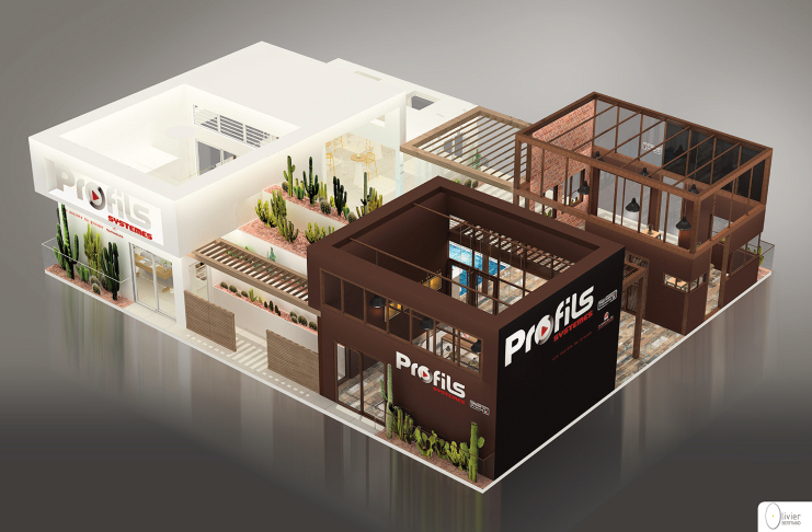 ©Profiles SystèmesCréé par le standiste Olivier Bertrand, le stand de l'entreprise déploie plusieurs thématiques sur une superficie de 306 m². Il s'organise autour de quatre pôles : accueil général, villa résidentielle, véranda toiture plate, véranda industrielle et espace bureau d'architecte & bureau des tendances. Plusieurs entrées assurent ainsi une circulation fluide entre les différentes zones.