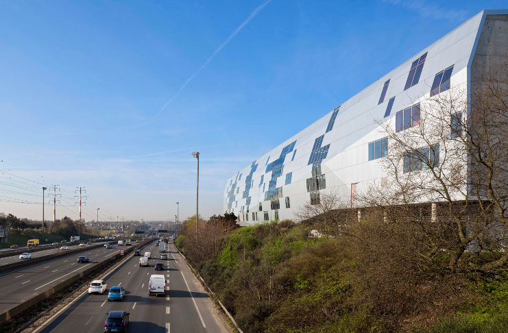 Seconde réalisation, le mur antibruit du nouvel écoquartier de Fresnes (94). Implanté sur 132 m le long de l'autoroute A6 et conçu comme un écran protecteur acoustique, il préserve les usagers et habitants du bâtiment K des nuisances sonores générées par une forte circulation automobile. Son enveloppe adopte une volumétrie aux pliages multiples et répond à la symbolique environnementale d'un bouclier acoustique. Elle est habillée de cassettes métalliques et percée d'ouvertures grâce au système de façade Géode.