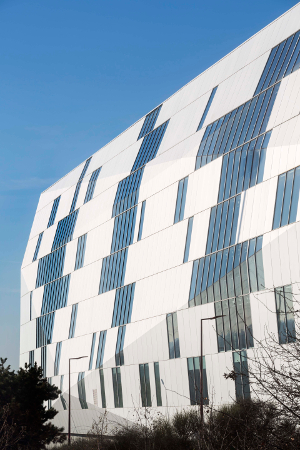 Pour cet ouvrage, Technal a créé un profil spécifique en aluminium de 100 mm d'épaisseur, qui garantit une performance de 42 dB, et un système inédit mixant murrideau et verrière. Celui-ci assure une étanchéité totale des parties légèrement horizontales et des cassures en pointes de diamant. Les 783 m² de menuiseries Géode semblent disposées de manière aléatoire, conférant à l'ensemble une harmonieuse dimension cinétique. Niché derrière ce mur antibruit, le bâtiment K (R+7) abrite un centre d'arts, une entreprise d'optique, des logements sociaux, pour étudiants et jeunes actifs..