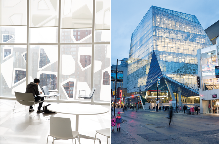 Ecrin de verre éblouissant inspiré par l'agence Zeidler Partnership Architects (Toronto) en collaboration avec Snøhetta (Oslo), la vêture translucide à motifs rectangulaires du nouveau Centre d'apprentissage des étudiants de l'université Ryerson compose admirablement avec la lumière en une variété d'ambiances intérieures.