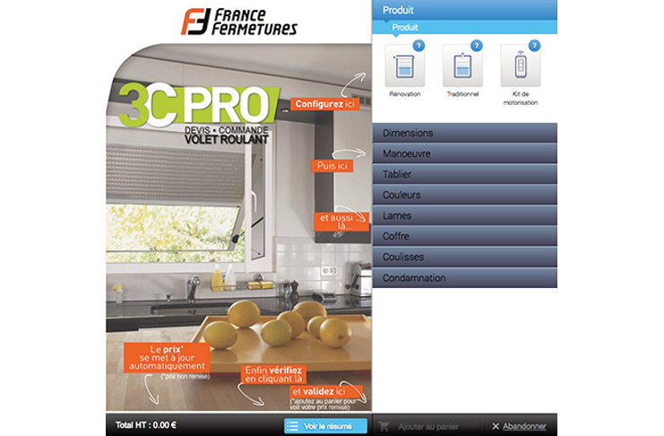 Ergonomique, intuitif et rapide avec une prise en main améliorée, le configurateur 3C Pro s'adapte à tous les formats d'écran. Conçu comme un véritable outil d'aide à la vente, il optimise le temps, vise à l'autonomie et la réactivité pour ainsi concevoir, chiffrer et valider un projet directement avec le client particulier.www.france-fermentures.fr