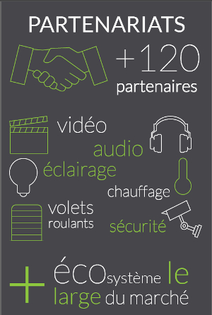 À ce jour, l'entreprise s'appuie sur un réseau de plus de 120 partenaires industriels dans tous les métiers de la maison - soit autant de passerelles technologiques qui permettent à Delta Dore de proposer l'écosystème le plus large en France pour le pilotage la maison connectée : chauffage, éclairage, ouvertures, sécurité, son et télévision.