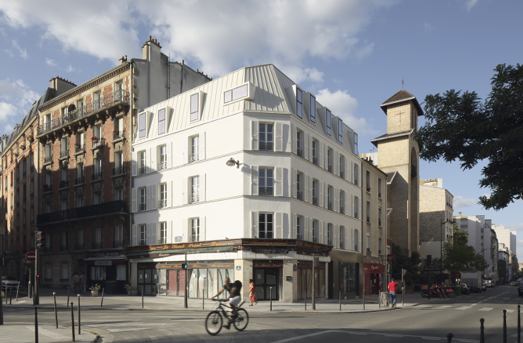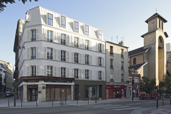 La surélévation de l'immeuble de logements sociaux, situé dans le 14ème arrondissement de Paris, a été menée en étroite collaboration par le maître d'ouvrage Elogie et les maîtres d'oeuvre Vazistas (Hellhake + Graves Architectes) et Fay Architecte.