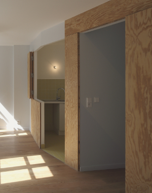 L'implantation en angle du bâtiment, qui couvre d'Est en Ouest la course du soleil, a été un élément déterminant dans l'organisation spatiale des logements. Les cloisonnements prennent comme axes les baies existantes et les mettent en perspective.