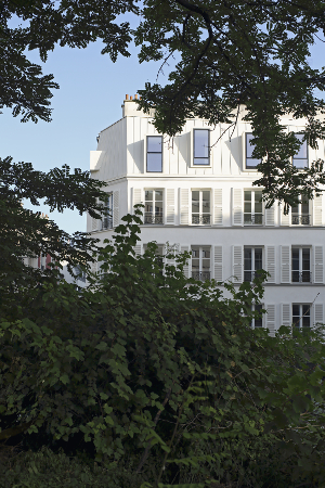 Conjugués à la toiture en zinc laqué blanc, ils confèrent une écriture moderne à l'immeuble faubourien. Les menuiseries verticales Technal (L. 0,85 x H. 1,85 m) suivent la même trame que celles des étages du dessous en bois.