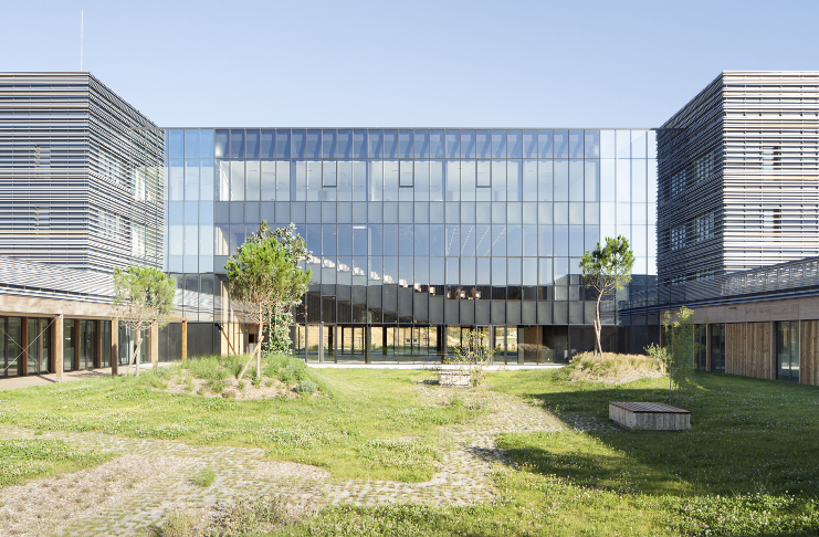 Bertrand Renaudin: "La superposition et la variation de densités est possible grâce à la variation du pas entre les ventelles horizontales qui se développent sur tout le périmètre des façades. La répartition irrégulière des lames horizontales répond ainsi aux besoins et contraintes spécifiques des locaux (bureaux, laboratoires, espaces techniques, etc) et offre pour le pôle Ecotox, une lecture singulière et ancrée dans son contexte.".