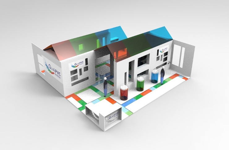 Grâce à un jeu de perspectives entre les murs, le sol et le plafond, Sarah Bisson invite le visiteur dans un espace architectural lumineux et coloré où il évolue librement dans l'univers du PVC et de la marque QualiPVC fenêtre.