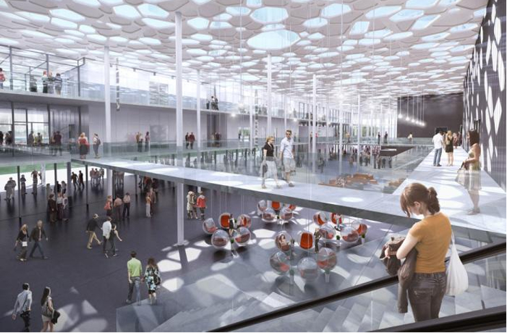A l'intérieur, une "rue" permet d'articuler l'espace en quatre "univers" : une grande halle de 1.800 m², un "village" avec trois amphithéâtres, une énorme "nef" de 2.400 m² à la fois salle d'exposition ou de spectacles sportifs ou musicaux (entre 2.000 et 4.000 spectateurs) et enfin un espace dédié à des salles de réunions.
