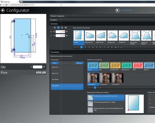 Les processus de vente se trouvent accélérés et simplifiés. Un configurateur spécifique aux clients des fabricants sera également disponible. La configuration guide l'utilisateur intuitivement à travers le processus jusqu'à l'obtention d'un devis chiffré avec graphique. De même, le client voit l'historique complet de la commande et peut supprimer ou ajouter des produits à son panier d'achat. En raison de la forte intégration avec le système A+W ERP du fabricant, les produits, prix, remises et restrictions du fabricant sont toujours à jour. Les paramètres d'affichage des détails du calcul de prix peuvent être bien sûr configurés individuellement. Le transformateur met ainsi à disposition un système de saisie de commandes 24h/24 et 7j/7 avec quasiment toutes les options permettant d'interpréter la pertinence des demandes (erreurs de saisie, demandes de précisions, contrôle de faisabilité...). Selon les paramètres, toute une gamme sélectionnée de verres isolants, trempés, feuilletés et spéciaux est disponible, ainsi que toutes les formes et tous les traitements de façonnage.