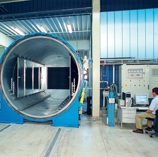 Ceux pour le verre feuilleté plat et bombé se distinguent par la robustesse de construction du container en acier de type PN355NH. Fermeture de la porte avec double courroie dentée à couvercle mobile, réalisé avec anneau forgé en acier de type Astm A350-LF2. Le mouvement de la porte, aussi bien en ouverture/fermeture qu'en rotation, est complètement hydraulique et effectué par une centrale pour une précision optimum des mouvements, avec possibilité de régler la vitesse synchronisant ainsi ces opérations. Le moteur utilisé pour le déplacement de l'air et de type pressurisé avec refroidissement à eau, permet une économie d'énergie de 25 % et une réduction de la maintenance. Un meilleur espace interne assure un chargement jusqu'à 12 T de verre à l'intérieur de l'autoclave. La qualité de l'isolant à haute densité associée au rendu thermique de batteries spéciales garantissent une importante économie énergétique. La fourniture de l'autoclave comprend un silencieux de chargement d'un niveau sonore inférieur à 85 dba, un bénéfice de lavage pour éliminer les résidus de PVB et pupitre de commande centralisé pour gérer toute l'implantation. Le système de contrôle et supervision comprend un software de type Scada particulièrement adapté à l'application de la lamination du verre. Les autoclaves existent en plusieurs modèles selon les dimensions utiles souhaitées. Température de fonctionnement 140°.