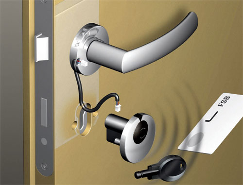 assortie sous forme de technique intégrée et désormais brevetée. Le processus d'identification électronique est directement lié à un module mécatronique logé dans un espace minime, dans la rosette de la béquille. La partie électronique a été intégrée dans le volume d'un cylindre profilé. Ce module s'installe par fichage dans la serrure et vissage depuis le côté opposé. Le cœur de ce système de mécanique de précision est un élément de couplage à commande électronique qui, en cas d'identification positive, garantit la manœuvre immédiate de la serrure via la poignée de porte. Le système de garnitures EZK est complété par des modules et des solutions informatiques de saisie de l'heure ou des données personnelles. EZK se caractérise par l'aisance de maniement ; l'identification d'accès s'effectuant sans contact et donc sans aucune peine. EZK peut être orienté en fonction des souhaits et des besoins exacts de ses utilisateurs et adapté ou élargi à tout moment. C'est une solution autarcique, ne nécessitant aucun aménagement architectural préalable en termes d'alimentation électrique, sans liaison vers des interfaces externes ; elle convient à toute serrure à cylindre profilé répondant aux normes DIN, et offre la possibilité de rééquiper facilement des portes existantes. FSB