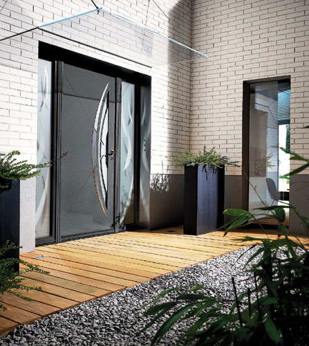 La société Samic développe son offre de portes d’entrée avec de nouveaux modèles de portes mixtes avec parties latérales associées, portant la gamme de 28 à 35 modèles, orientée vers un design contemporain. Dans la gamme, le modèle Equinoxe, est proposé en 2 modèles : la porte extérieure simple équipée d’un insert et d’une poignée rosace en inox brossé, avec l’intégration d’un vitrage dépoli avec motif clair ; et la porte extérieure avec parties latérales (ici avec une finition Gris B 8821). Ces parties latérales fixes sont disponibles vitrées en vitrail, avec finition gris, inserts et poignée rosace en inox brossé. Samic
