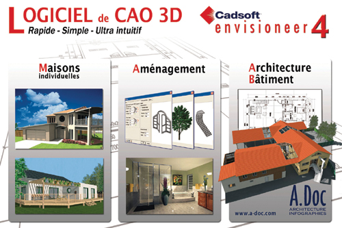 Cadsoft Envisioneer 4.0 est la toute dernière version du logiciel CAO 3D développé par Cadsoft et spécifiquement conçu pour les professionnels de l’architecture et du bâtiment. Cadsoft Envisioneer 4.0 offre une solution complète, rapide, simple et accessible à tout utilisateur en regroupant la conception, le dessin, l’annotation, le quantitatif estimatif, les présentations photo-réalistes et l’animation en un seul et unique logiciel. Il propose une technologie orientée objet, une interface 100 % nouvelle et intègre, entre autres, un concepteur de menuiseries complexes. Avec le logiciel, il est également possible d’estimer et de chiffrer le projet rapidement, par lot de chantier et de présenter une visite virtuelle des projets. Cadsoft - Distribué en France par A-Doc