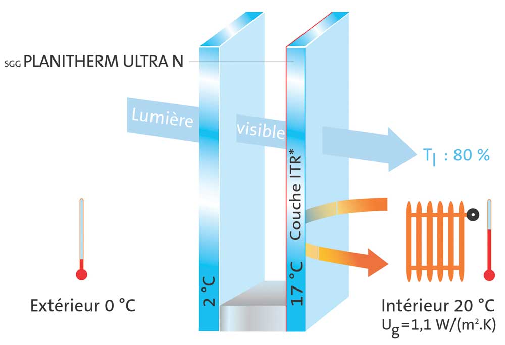 Saint-Gobain Glass propose un nouveau vitrage à isolation thermique : le SGG Planitherm® Ultra N, qui permet d’obtenir un coefficient thermique Ug particulièrement bas : 1,1 W/(m2.k). Le haut niveau d’isolation thermique du verre SGG Planitherm® Ultra N est obtenu grâce à la couche mince et transparente, de matériaux d’origine métallique, déposée sous vide. Cette couche réfléchit les infrarouges thermiques et limite les déperditions de chaleur par rayonnement. Elle confère au vitrage une émissivité extrêmement faible, capable d’atteindre le coefficient Ug de 1,1 W/(m2.k) dans la composition 4 (16 argon) 4 mm. La transmission lumineuse de SGG Planitherm® Ultra N est proche de celle d’un verre ordinaire (TI = 80 % en vitrage isolant). Saint-Gobain Glass