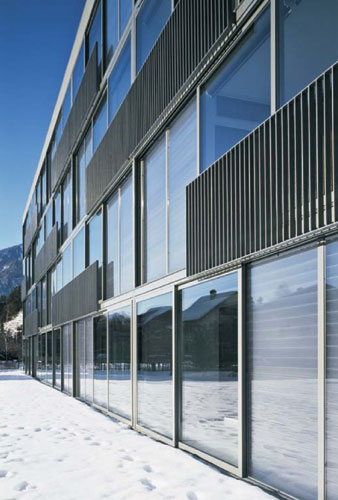internes : le 1er est un prisme en plexiglas, qui réfléchit totalement la lumière et le 2ème est un réservoir rempli de sel et d’eau (qui constitue un matériau à changement de phase), fermé par un obturateur étanche. Le liquide peut fondre ou geler selon la température de fusion (» 27° C). L’énergie thermique se trouve stockée dans sa paroi. L’été, le matériau se liquéfie dans les conteneurs, emmagasinant ainsi de la chaleur ; l’hiver, il se solidifie et restitue l’énergie thermique stockée. Ce mélange permet d’obtenir une capacité de stockage de l’énergie 10 fois plus importante que celle du béton. GlassX a récemment remporté le Prix solaire suisse 2007 pour ce produit. GlassX