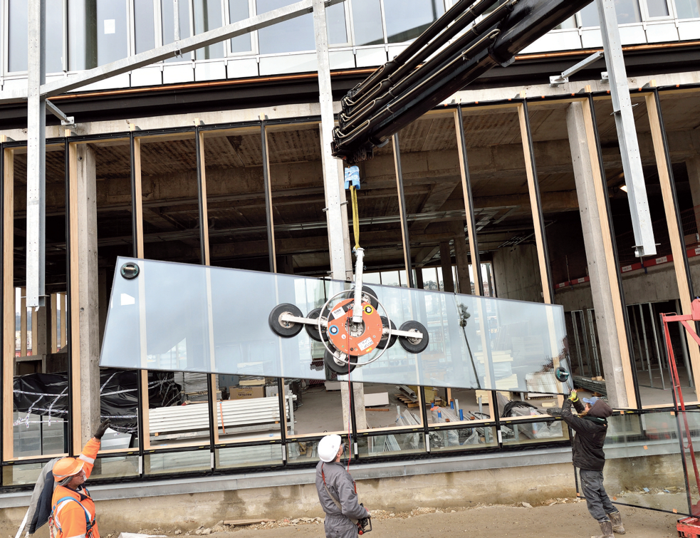 Le palonnier à ventouses GP10Rebetta de Covadis peut basculer ou tourner la feuille de verre. ll peut aussi être suspendu à une grue pour assurer la pose du vitrage sur chantier © Covadis