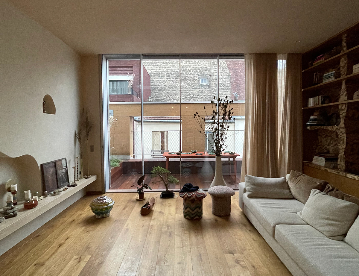 D'un voyage en Amazonie – une épopéee de 2 000 km jusqu’à la réserve indienne des Satere Maw – Sarah Valente crée la fondation Greenline Foundation, projet entrepreneurial porteur de sa passion et de son respect pour le monde végétal qu’elle estime vital de protéger, et source de son expression artistique. De son exploration intérieure, Emmanuelle et son frère Philibert Déchelette, fondateurs de l’agence Déchelette Architecture à Paris 10e, ont su retranscrire « ma vocation de la nature, du monde végétal, des forêts en utilisant des techniques et des matériaux plus doux comme la terre et le bois. Mais aussi l’aluminium, en référence aux toitures parisiennes, et pour se raccorder à l’architecture de Paris », expose la propriétaire.
