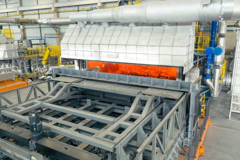 04 La fusion : les déchets d’aluminium "délaqués" sont chargés dans un premier four de fusion avec, si besoin, un complément ponctuel de minéraux pour garantir la qualité de l’alliage. Chauffé à 1 100°C, le four de fusion produit 28 tonnes d’aluminium en 4 heures. L’aluminium liquéfié est ensuite transféré vers le four de maintien à 740°C, en attente de la coulée.