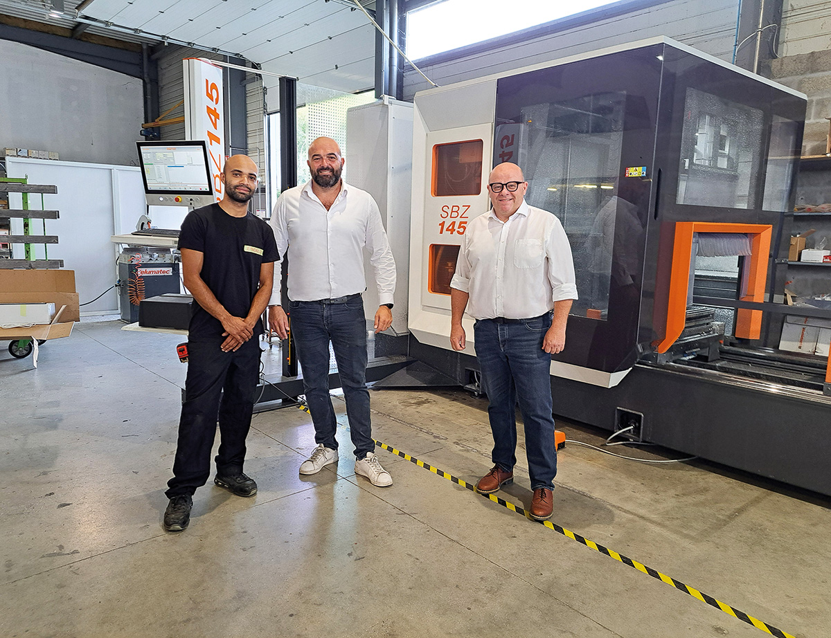 Photo ouverture © elumatec - Eficalu - (De g. à dr.) Remy Copol, pilote du tout nouveau SBZ 145, formé par elumatec à l’utilisation et à la maintenance quotidienne du centre d’usinage aux côtés d’Anthony Neves, dirigeant d’Eficalu et de Cyril Benoist, responsable régional Sud-Ouest Voilàp