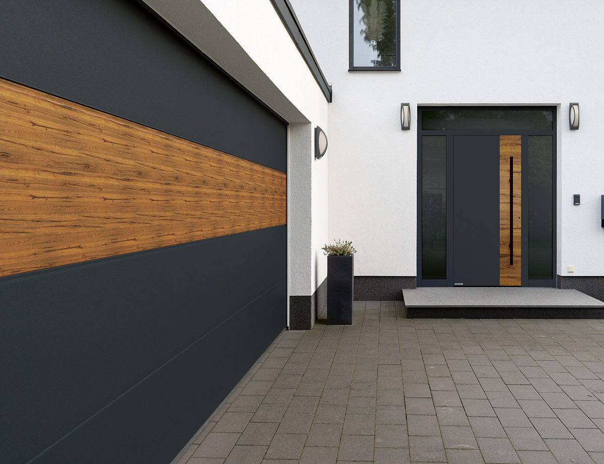 Photo ouverture © Hörmann - Habillée de la nouvelle finition VarioDesign, la porte de garage LPU 42 s’harmonise ici avec la porte d’entrée ThermoSafe motif 878. Cette nouvelle finition de porte de garage sectionnelle offre une liberté inédite pour créer sa propre porte de garage et en faire un véritable élément de design. VarioDesign permet de combiner jusqu’à 3 types de panneaux différents (positionnement libre) disponibles dans plus de 30 décors Duragrain et 6 décors classiques