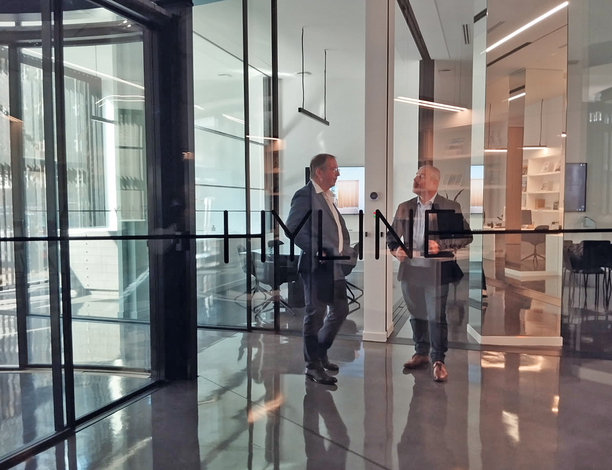 Dans son showroom haute couture de 300 m², le concepteur fabricant de menuiseries minimalistes Hyline laisse libre cours aux espaces mobiles et à la fluidité, entre bureaux, salle de réunion à la capacité d’accueil d’une vingtaine de personnes avec écran diffusant ses solutions au fil d’une sélection de villas et mises en œuvres spectaculaires, atelier parfaitement dissimulé pour les installateurs ou encore "l’experience room", « dont la table centrale sans chaises permet de projeter un plan d’éxécution pour des solutions spécifiques prototypées et de travailler sur une réalisation commune à hauteur d’hommes », spécifie Aïda Berrada, responsable communication et Expérience Clients, et de souligner : « rester dans sa verticalité engage une dynamique favorable aux échanges et à la cocréation ». Un point de rencontre privilégié et un outil à vocation d’accompagnement en amont jusqu’en aval… et plus encore, avec un SAV forcément en congruence avec les puissants engagements de la marque.