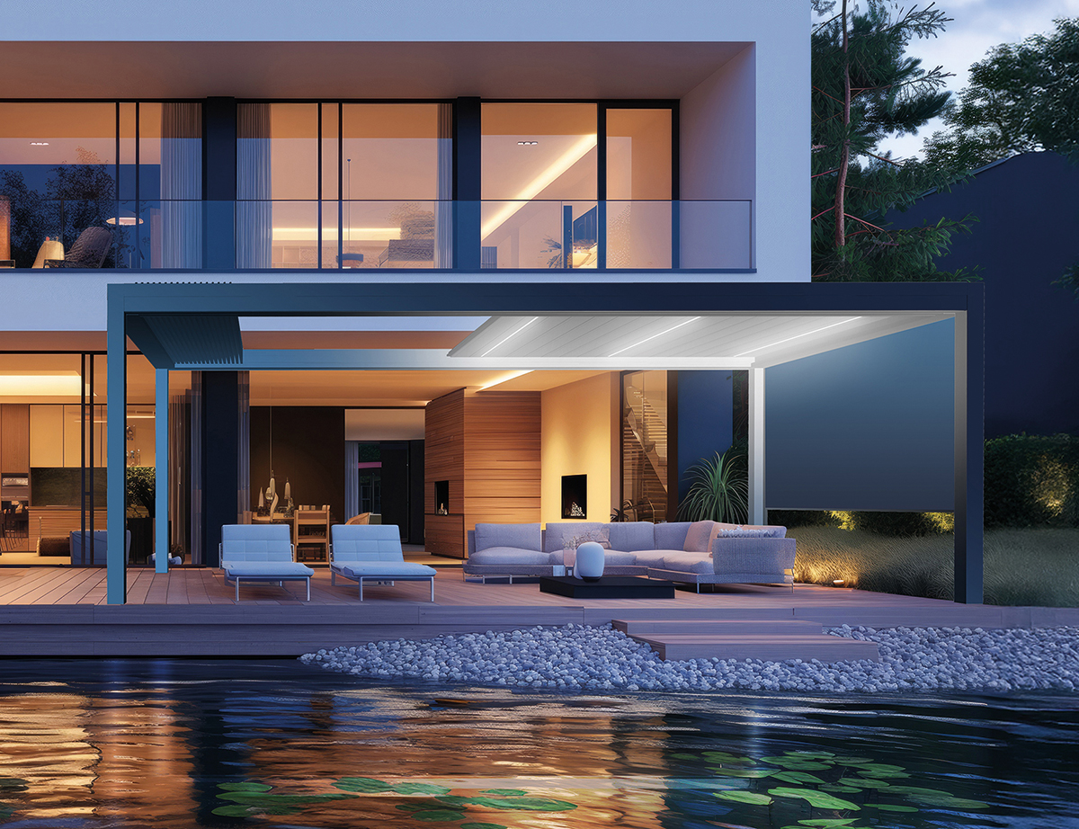 Avec ses dimensions généreuses en un seul tenant – une avancée jusqu’à 7 290 mm hors tout (largeur 4 000 mm) en un seul module –, Marquises a ici déposé un brevet pour une rétractation et gestion des lames par zones. Ce système permet un contrôle total de l’ensoleillement, de la ventilation et de la luminosité à toute heure de la journée.