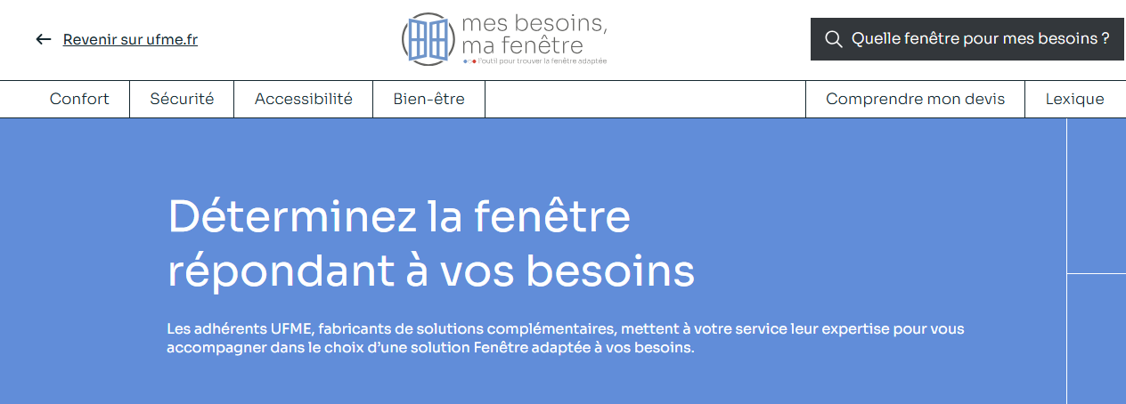 Développé par la section Professions Associées de l’UFME, l’outil digital "Mes besoins, Ma Fenêtre" guide les particuliers dans leurs choix de la menuiserie la plus adaptée à leur projet. Accessible dès la page d’accueil, cet espace pédagogique répertorie des informations détaillées sur différentes thématiques telles que le confort, la qualité de l’air, la santé et la sécurité. Il propose un lexique complet et un devis type avec toutes les mentions légales que le particulier doit systématiquement retrouver. Un questionnaire, en neuf étapes, aide également les utilisateurs à identifier leurs besoins spécifiques.