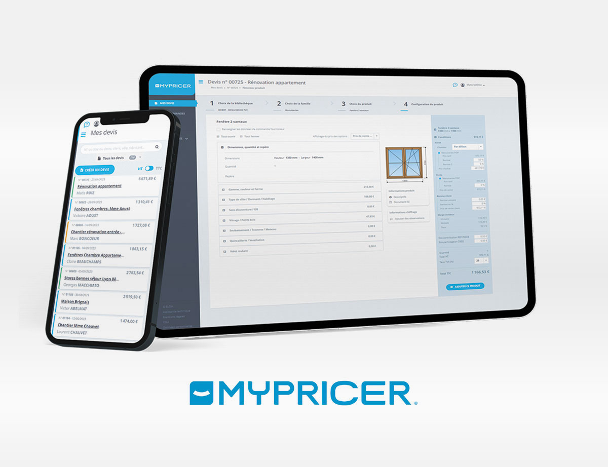 La solution MyPricer, présentée sur Fensterbau Frontale : développement européen avec un seul outil. Ce logiciel de chiffrage simple et intuitif permet aux clients et prospects de chiffrer en 5 minutes, partout en Europe, les produits des fabricants de menuiseries, stores et fermetures.