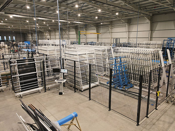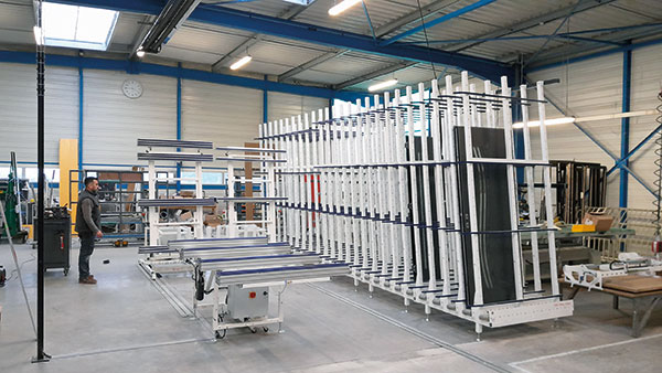 Le stockage des vitrages chez les grands fabricants de menuiseries est aussi un enjeu fort. Ils arrivent sur chevalet et peuvent être utilisés directement : le chevalet est alors amené au pied de la ligne de production de la fenêtre. Mais les vitrages peuvent également être gérés par un transstockeur automatique et être délivrés au dernier moment, en fonction des besoins. L’automatisation des stocks de vitrages limite les risques de blessures : c’est souvent dans le stock de verre que les opérateurs se blessent en manipulant de lourds éléments.