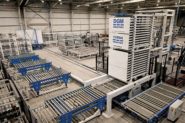 © DGM Industries - D.R. - Mise au point par Corba, filiale de DGM Industries, cette ligne de contrôle et de stockage de vitrages automatisée évite aux opérateurs la manipulation de charges lourdes dans les stocks verriers, réduisant les risques d’accidents de travail