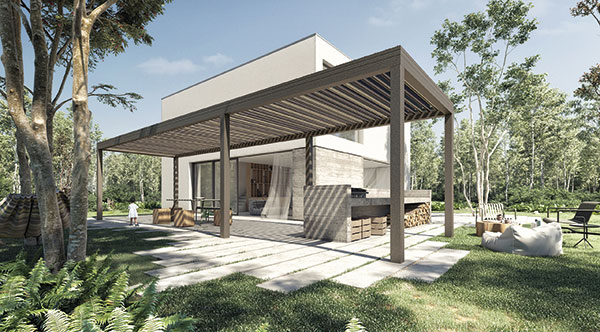 © Isosta - Pergola 3D avec coin cuisine et trame spot – panneaux Isosta