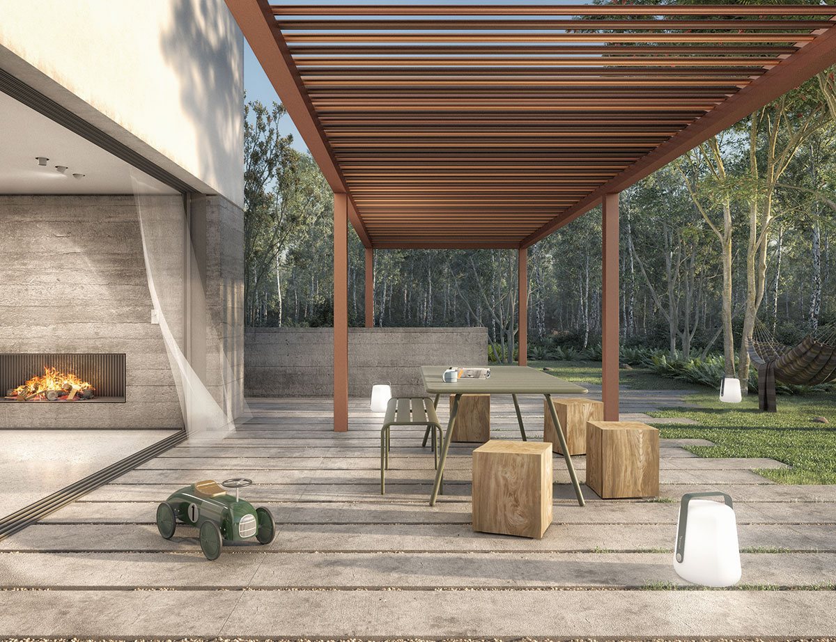 Photo ouverture © Profils Systèmes - Pergola Wallis&Outdoor® signée Profils Systèmes et Dank Architectes - modèle Copper où le retour aux matières brutes repose sur un contraste puissant entre un brun-rouge profond et des éclats orangés lumineux créateurs d’une ambiance particulièrement chaleureuse