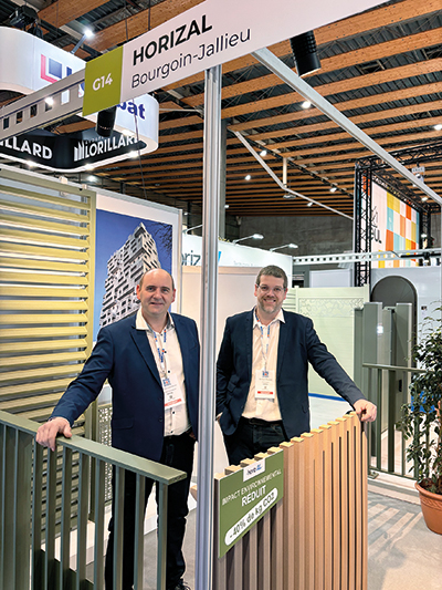 Souhaitant communiquer sur les tendances, le fabricant de garde-corps a choisi de montrer des modèles plus écologiques… Sur son stand, deux modèles attirent l’œil du visiteur : un garde-corps au barreaudage biosourcé et un autre modèle en bois (Douglas). « Notre objectif est de contribuer à la diminution des émissions carbones par mètre linéaire de garde-corps, car le métier évolue ; les clients nous demandent les fiches FDES des produits, nous devions proposer ce type d’offre », nous apprend Arnaud Droulez, prescripteur Horizal. « Le bois ou le matériau biosourcé, sur lequel nous travaillons avec notre partenaire Neolife, est associé à une ossature aluminium, il s’agit de produits mixtes », précise Hervé Demeulemeester, directeur commercial Hauts-de-France, Champagne-Ardenne, Belgique, Luxembourg. Si le gros du marché se caractérise par les garde-corps en aluminium, les premiers chantiers dans ces matériaux sont en cours…