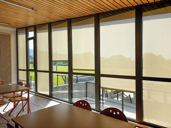 © Mermet - Mermet propose des produits green fabriqués à partir de fils issus du recyclage et mène des programmes d’optimisation énergétique dans ses usines ; ici, pour le bâtiment périscolaire de Porcieu-Amblagnieu en Isère, qui nécessitait une protection thermique et visuelle optimale afin de répondre aux problématiques de chaleur et d’éblouissement tout en s’intégrant parfaitement à la façade, l’architecte AMMA a choisi le tissu Satiné 5500 de Mermet, coloris 0720 Perle Lin pour équiper les stores extérieurs, réalisés par le fabricant de stores Sun&Lux