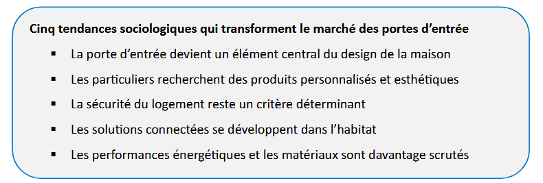 Au-delà de la conjoncture, l’étude met en évidence plusieurs évolutions dans les attentes des particuliers. La porte d’entrée est devenue un véritable élément de signature architecturale de la maison. TBC Innovations – Mars 2026 - page 3 Les modèles contemporains aux lignes épurées séduisent particulièrement les acheteurs. En 2025, les portes au design contemporain représentent 61 % des portes installées, contre 50 % il y a dix ans. La porte d’entrée contribue à l’identité visuelle de la maison. Les particuliers cherchent à harmoniser la porte d’entrée avec le portail, la porte de garage, la clôture, les couleurs des volets.